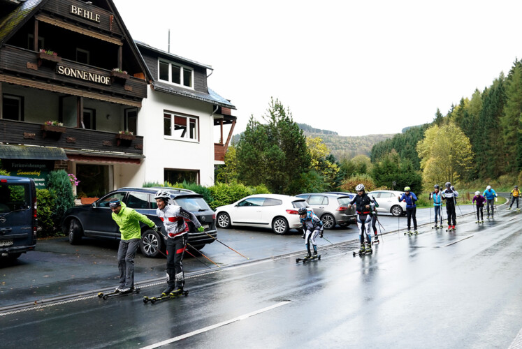 Auf dem Programm fand sich aber nicht nur Training, sondern auch ein Update bezüglich Material und erste Gespräche über die Wettkampfplanung im Winter. Nach der Begrüßung ging das Wort deshalb direkt an Gerald von Einlegesohlenhersteller Solestar. Der neue Teampartner stattet alle Mitglieder mit seiner neuen Nordic-Sohle aus und Gerald erklärte anschaulich welche Vorteile die spezielle Sohle für den Langlaufschuh mit sich bringt. Schließlich gilt es, den Fuß beim Langlaufen bestmöglich zu unterstützen, damit wertvolle Kraft nicht schon allein durch die Stützarbeit verloren geht. Im Anschluss ging es dann aber direkt raus auf die Straße. Direkt vor dem Hotel führt ein Radstreifen am Rand der Durchgangsstraße entlang und es erschließt sich eine kupierte Strecke bis zur Staumauer des Diemelsees und darüber hinaus. Während sich die leistungsorientierten Athleten auf eine lange Doppelstock-Tour machten, nutzten die ambitionierten Hobbysportler eine kleine Seitenstraße, um zusammen mit Teamkapitän Thomas Freimuth an der Technik zu feilen. Kurz vor der Dämmerung traf man sich dann wieder am Hotel und machte sich nach einer Dusche auf zum gemeinsamen Abendessen in Willingen. Florians Einladung zur Erkundung des Nachtlebens fand dann nach einem langen Tag keinen Zuspruch mehr und man trat gemeinsam den Rückweg in die Unterkunft an.