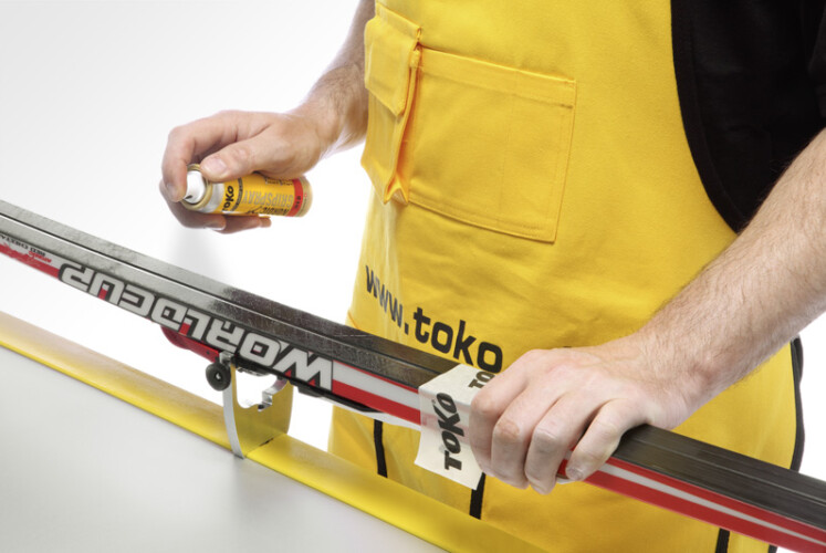 Je nach Schneetemperatur und Schneebeschaffenheit eine dünne Schicht Gripspray auf die Abstoßzone aufsprayen. Dabei zuerst die eine Hälfte und dann die andere Hälfte besprühen.