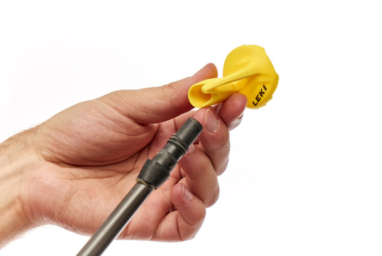 Beim Swix TBS System löst ihr die Sicherung durch einfaches Aufschrauben. Dann kann der Teller abgezogen werden. Beim Aufstecken der Rollerspitze darauf achten, dass ihr sie korrekt ausrichtet und sie in die beiden Schlitze am Stockrohr einrastet. Dann die Sicherung wieder zuschrauben. Fertig!
