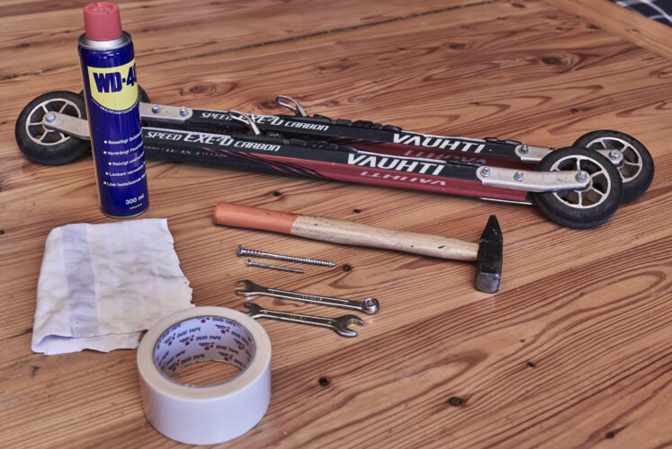 Da die Rollen/Räder mithilfe von Schrauben am Holm befestigt werden und die Kugellager meist sehr fest in den Felgen der Rollen/Räder sitzen, ist Werkzeug notwendig, um sie auszubauen. Hierfür würde man sich zwar Spezialwerkzeug wünschen, dieses gibt es jedoch nicht als Massenprodukt zu kaufen. Deshalb behelfen wir uns mit einer kostengünstigen Alternative, die ebenfalls ihren Zweck erfüllt. Benötigt werden zwei Sechskant-Maul- oder Ringschlüssel entsprechend der Größe der Mutter und des Schraubkopfes. Zum Ausbau der Kugellager dienen uns zwei Schrauben. Der Kopf der einen sollte genau den gleichen Durchmesser besitzen, wie die Achshülse. Die Zweite sollte einen deutlich größeren Kopf haben. Alternativ kann auch ein Holzstück oder eine Metallstange verwendet werden. Der Durchmesser darf den Durchmesser des Kugellagers nicht überschreiten. Als Auflage solltet ihre eine Klebebandrolle oder ähnliches nutzen, bei der das Rad nicht mit dem Kugellager aufliegt. Zum Herausschlagen dient ein Hammer und zur Säuberung ein Stoffrest sowie WD40 oder ein anderes Reinigungs- und Schmieröl.