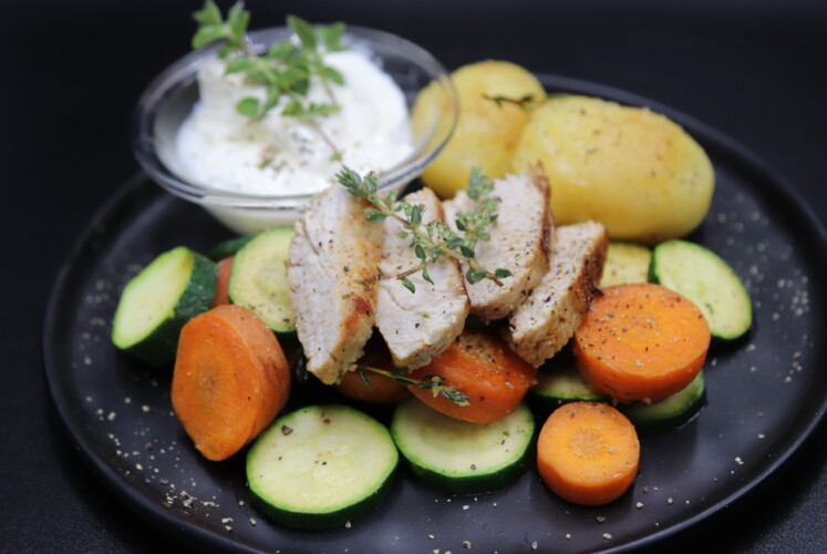 Abendessen: Putensteak mit Kartoffeln und Karotten und Zucchini