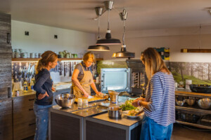 Dieses Gespräch hatte beim Mittagessen stattgefunden. Das ist an sich noch nichts Besonderes. Wenn es aber von den beiden Köchen Waltraud und Matthias täglich aus frischen regionalen Zutaten in der firmeneigenen Küche gekocht wird, dann ist das durchaus erwähnenswert. An den vier großen Tischen im Eingangsbereich des Firmensitzes trifft man sich zum gemeinsamen Essen und Austausch. Sicherlich einer der Punkte, warum so viele Mitarbeiter seit Jahren Maloja treu bleiben. Deutlich wichtiger dürfte aber der anständige Umgang und die Rücksicht auf die individuellen Bedürfnisse der einzelnen sein. Projektarbeit und flexible Arbeitszeiten ermöglichen den jungen Müttern im Team den Wiedereinstieg auf Teilzeitbasis.